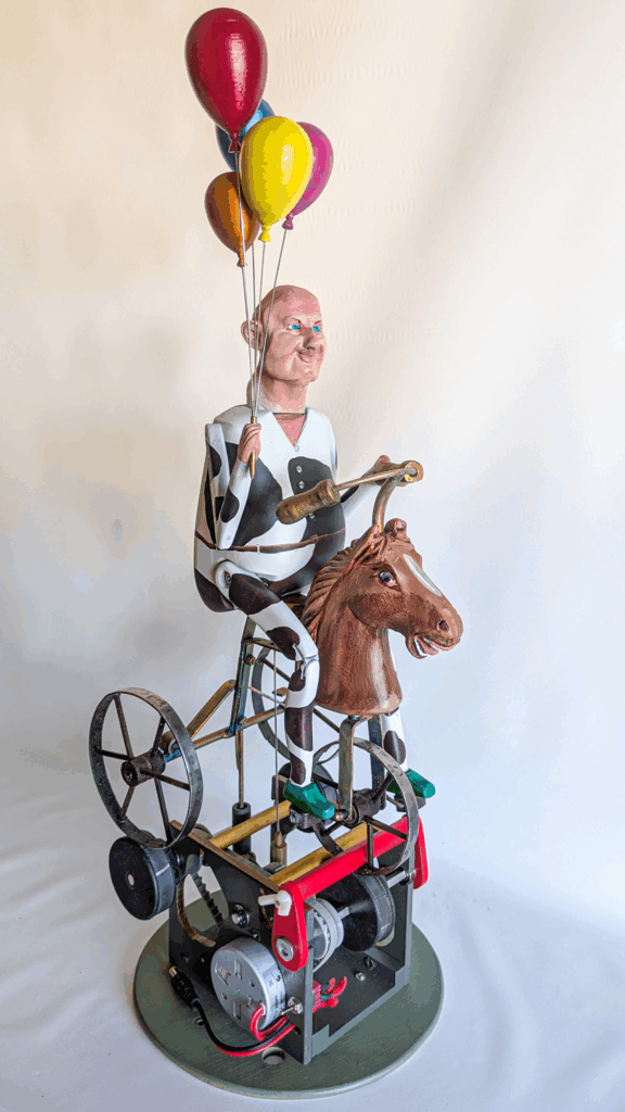 July 2019. Big Wheel Lift #1 seems to easily capture the attention of passers-by. One of the Jim’s Gym series of automata, a biped is exercising by pedaling and pulling levers. This motion in turn causes a big wheel to lift marbles from the bottom to the top, where they drop onto a track and roll back to the bottom. Lots of color and motion and interesting noises. Magnetic shock absorbers. This is a fun one.